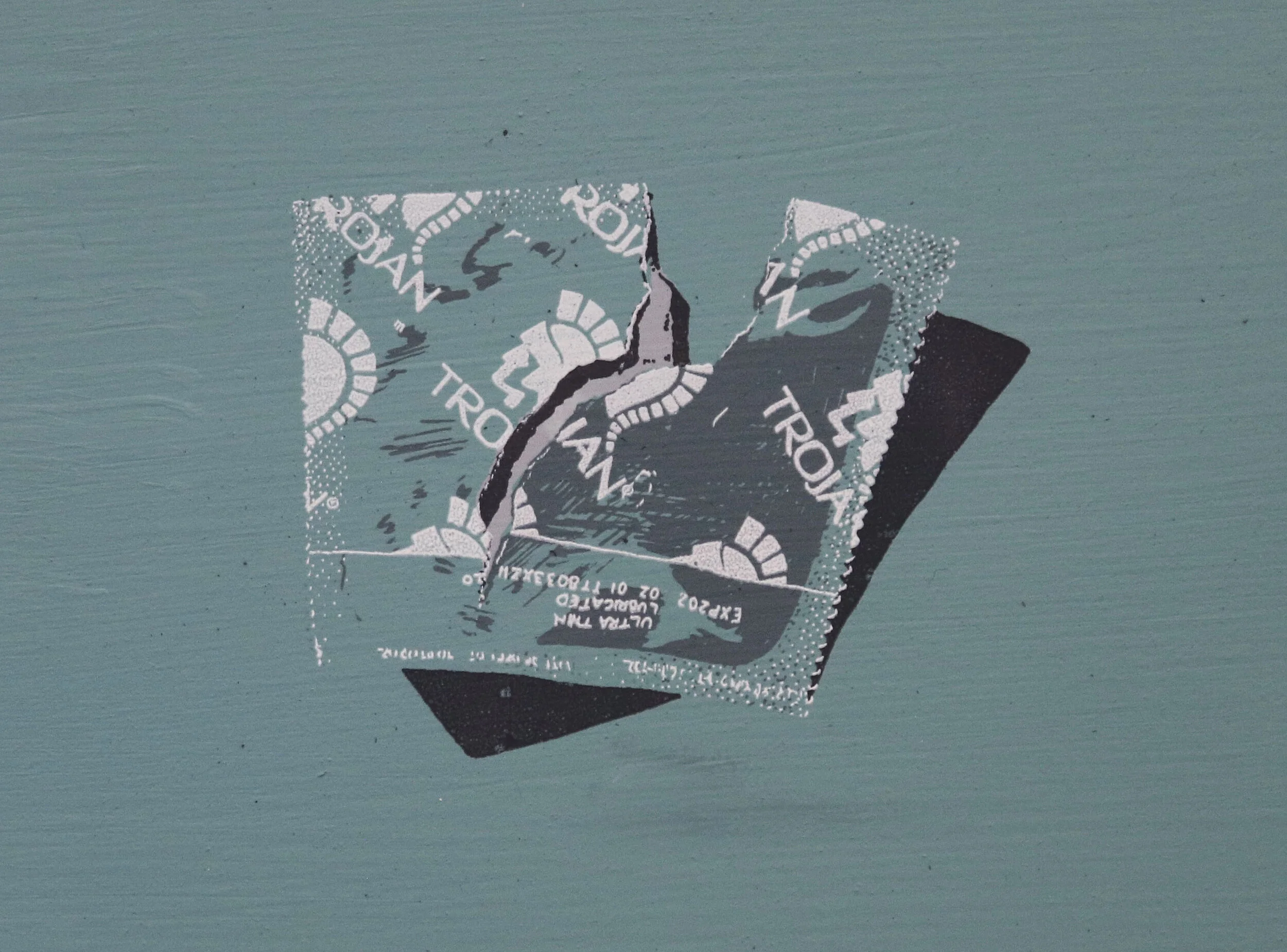 This work responds to an image from art history of Achilles and his lover/compatriot/first-man Patroclus. In this image, originally a painting from the interior tondo of a greek vessel, Achilles tenderly sees to an arrow wound sustained by Patroclus during battle. The inherent sexuality is felt through Patroclus' exposed genitals, his splayed legs, and the way one man cares for another. I put this image in context with a used trojan condom wrapper, thinking both about the prick of the arrow that entered Patroclus' arm and the prick of sex.